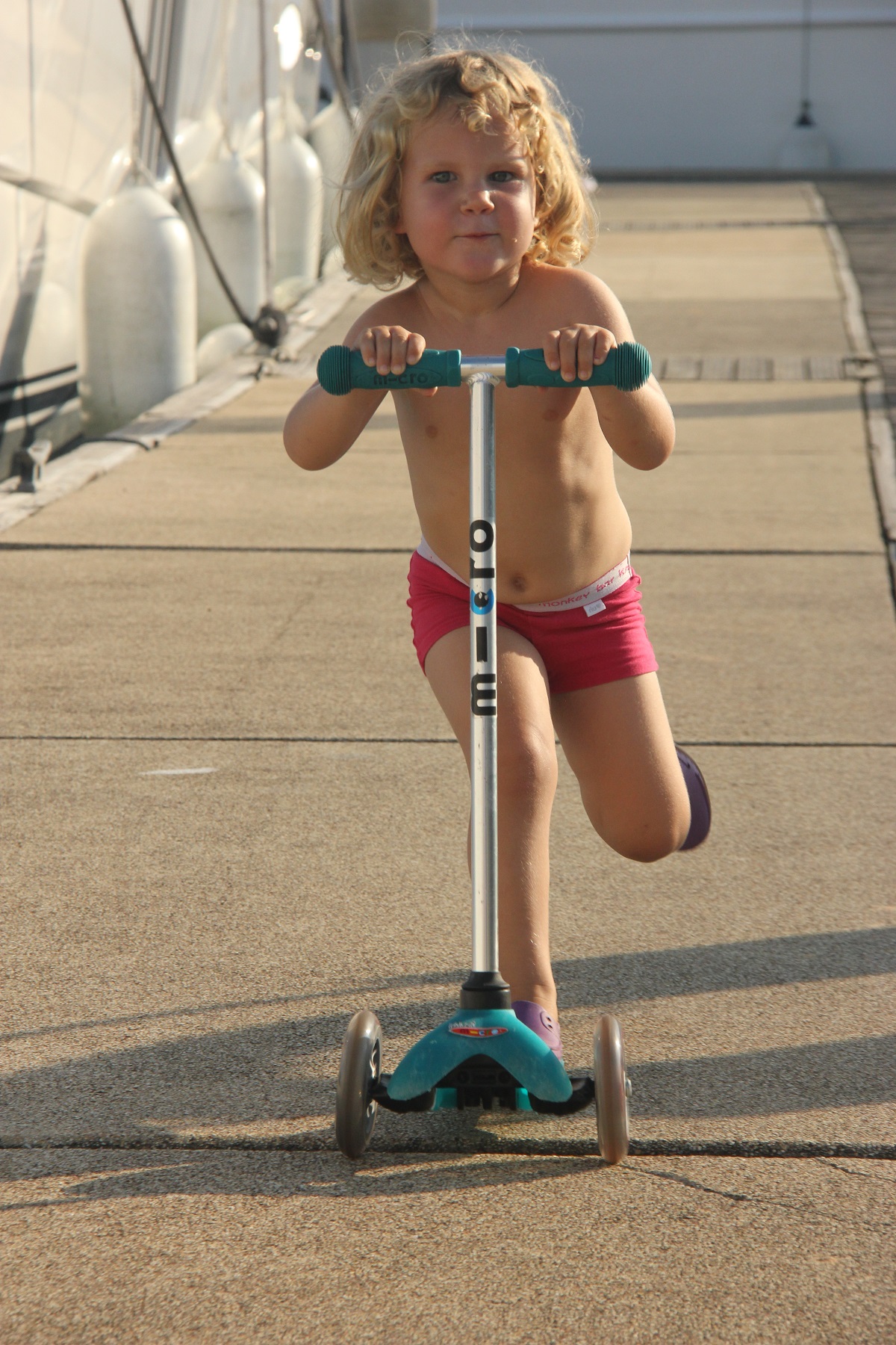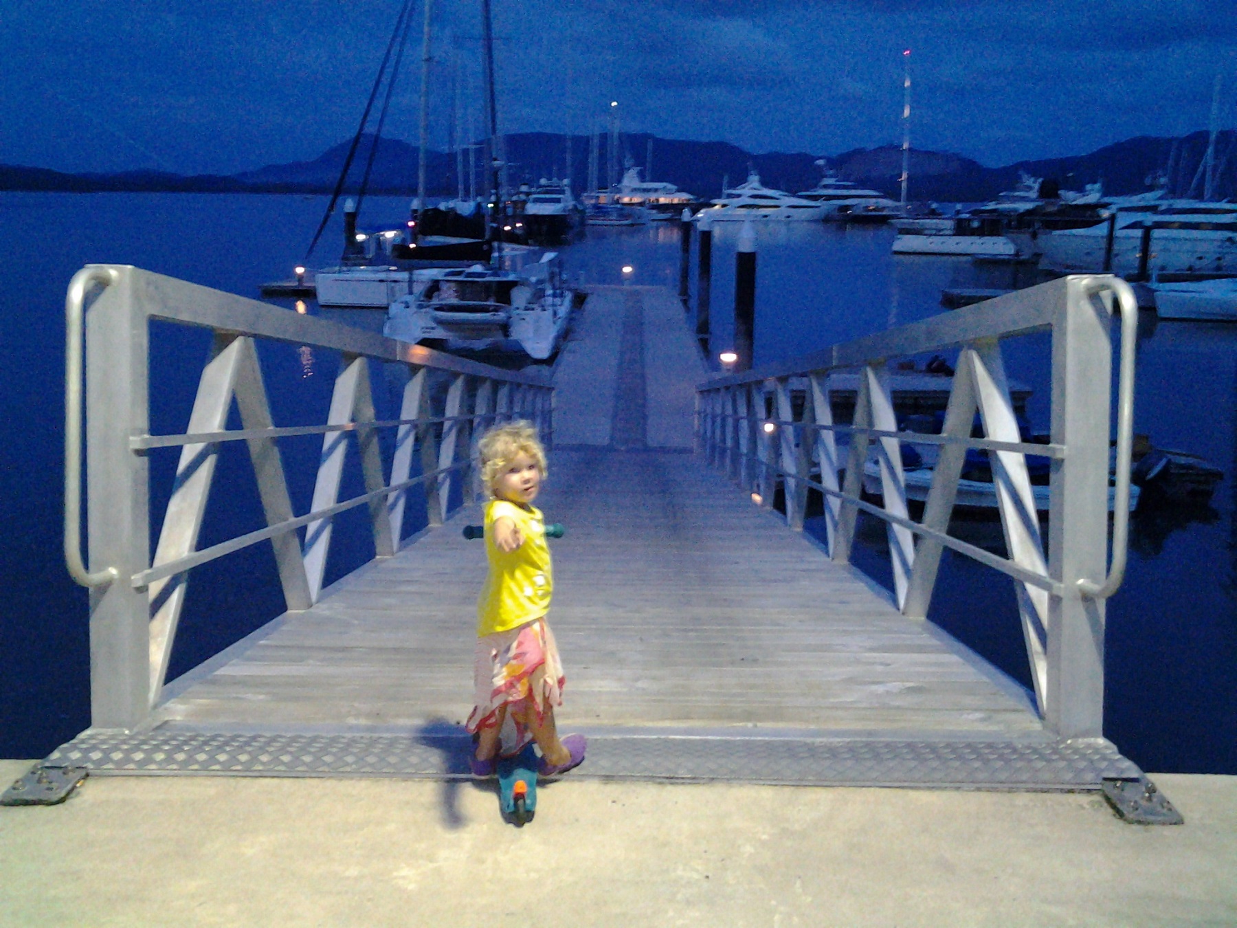 …albeit unforgiving, scooting grounds. There was an incident involving the ramp below, where it was confirmed that mini-micro scooters don’t float. It went something like this: Willow raced down the ramp. Dale and I remained frozen (in shock?) at the top. Willow commando rolled on the cement. The scooter flew off the dock to the left and sank to the bottom. Free-diving extraordinaire, Dale Rowney, recovered it. Everyone laughed and laughed. Phew. Willow only cried when Dale rinsed her scooter in fresh water. We can’t work her out.