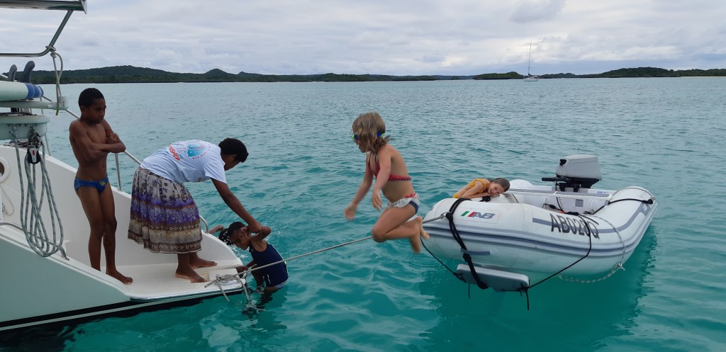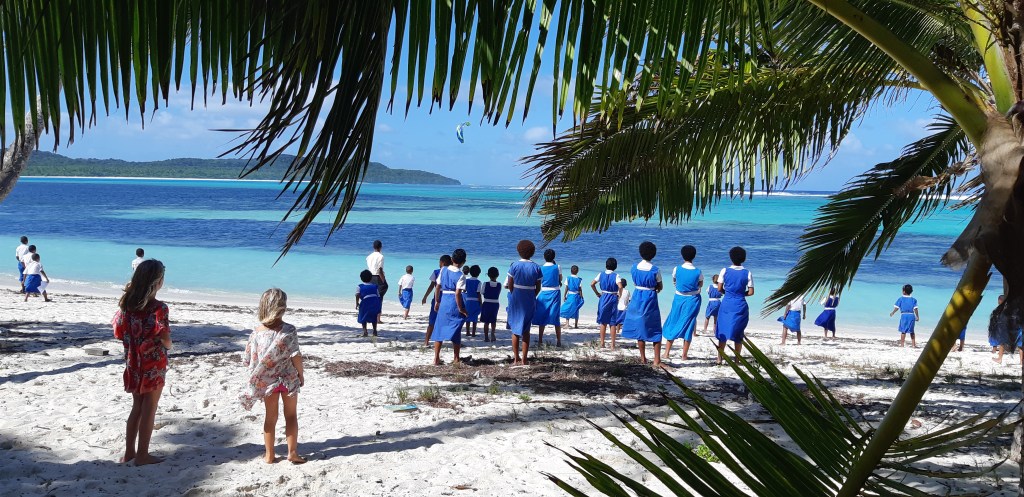 MORE LAU GROUP. The next island we visited is schooled on yachties, and yachties are schooled on it. It’s one of the most remote places we’ve travelled in terms of distance, supplies, services, communication, yet there were more yachties than we’ve seen all year. It’s somewhat of a fad it seems. “We’re going to ‘[blah]’“, everyone says, “You must go to ‘[blah]’“. People’s behaviour in groups fascinates us. We were swept along, if mainly to see what the fuss is about.