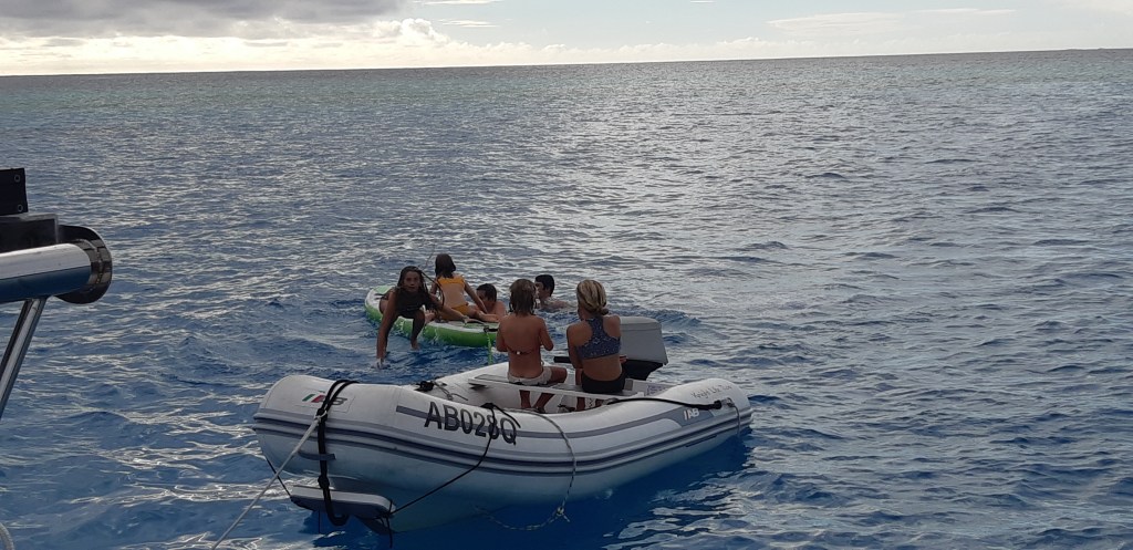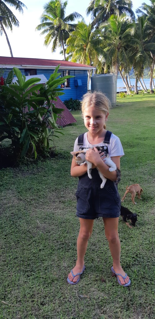 Dale found other yachties to surf with. The girls also found friends to surf with on a small inside edge of the reef. It was sketchy. We were offered a kitten. It was a hard sell.