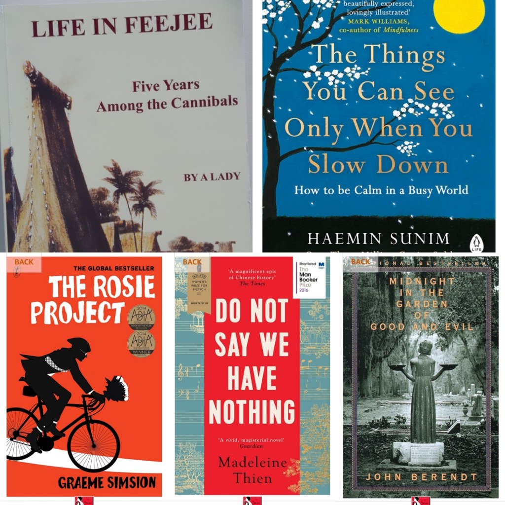 I finished only two of these books: The Rosie Project and The Things You Can See Only When You Slow Down. I enjoyed both. The others didn’t grab me and I’m too old now to persevere with books I’m still battling a third to half way through. I’m disappointed I didn’t finish Life in Feejee. It is written by “A Lady”, who turned out to be Mary Wallis, the wife of Captain Benjamin Wallis a sea cucumber trader in the mid-1880s. Unusually, Mary joined her husband on his voyages and the book is essentially her diary. It is very good, but soon becomes repetitive: Feud. Murder. Cannibalism. Feud. Murder. Cannibalism. Feud. Murder. Cannibalism. Et al.