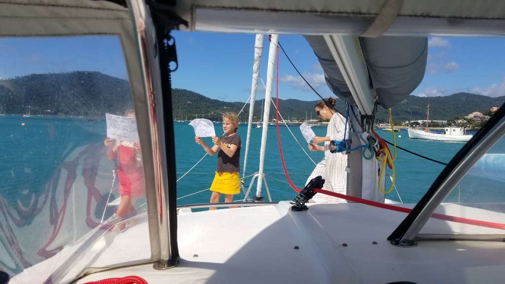 ‘The Land of Bareboat Charters‘ is gorgeous. Dale saved one, usually two, yachts a day. He set anchors, retrieved anchors, released hulls from reefs and sandbanks, released tender painter ropes from props, and roused on captains who dragged boats 200m through anchorages at night. Meanwhile, I bickered with old men who tried to anchor near us. They would insist they knew how to anchor. I would watch and insist they did not. It would become awkward. Happily, they would get cranky at me and move elsewhere; often to drag anchor onto another boat during the night. This is us, sharing how it is Whitsunday-style. Clearly, ‘Superhero Dale’ points to where he saved his last yacht.