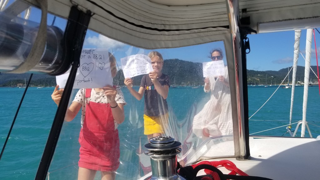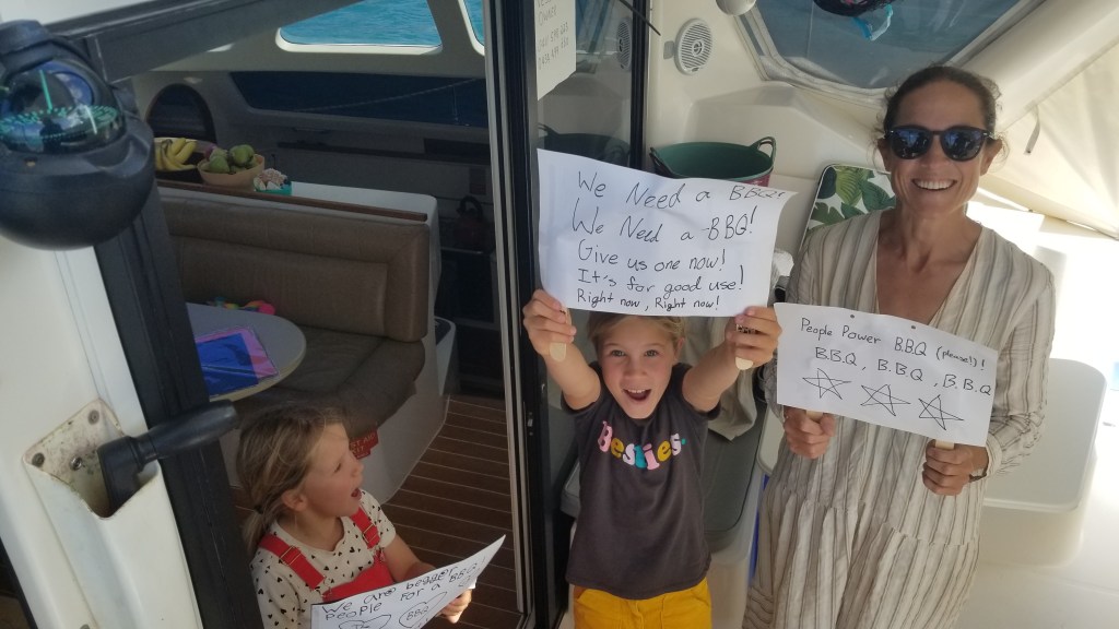 PROTEST MARCH. The girls want a BBQ. We have a BBQ, but it’s in storage because our super-sized dinghy and surfboards use the space, and generally we don’t eat meat. The girls seemed passionate. I joined the (unsuccessful) march.