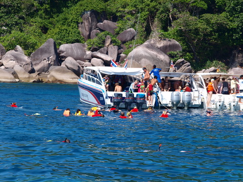 *Similan Islands. Snorkelling: Ko Bangu, Ko Bon, Ko Tachai (Reputably one of the best diving destinations in the world. We think this claim is debatable. Perhaps we are spoilt divers? Very good though. Average visibility. Coral walls. Huge granite boulders overgrown with coral and algae. Caves. Swim throughs. A variety and abundance of small sea creatures [Note: The big sea creatures are available for viewing on the tables of tourist restaurants in Phuket courtesy of the hundreds of commercial fishing boats circling the islands.] Crowded with divers on live aboard dive charters and day tripper snorkellers from Phuket and the mainland.)