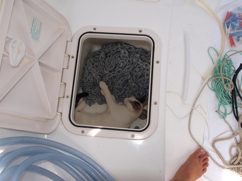 Mango cuddling up with the spare anchor chain.